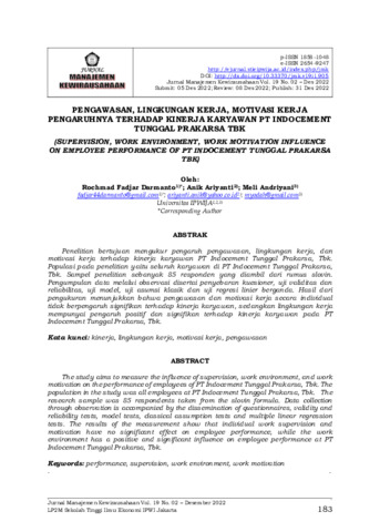 Rochmad, Fadjar Darmanto and Anik, Ariyanti and Meli, Andriyani (2022) Pengawasan, lingkungan kerja, motivasi kerja pengaruhnya terhadap kinerja karyawan PT Indocement Tunggal Prakarsa TBK. Jurnal Manajemen Kewirausahaan, 19 (2): 9. pp. 183-192. ISSN 1858-1048