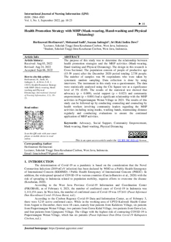 Herlinawati, Herlinawati and Mohamad, Sadli and Suzana, Indragiri and Sri Rizki Indira, Dewi (2022) Health promotion strategy with mhp (mask-wearing, hand-washing and physical Distancing). International Journal of Nursing Information, 1 (1): 3. pp. 18-23. ISSN 2964-4585