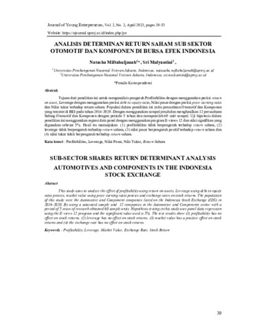Natasha, Miftahuljanah and Sri, Mulyantini (2023) Analisis determinan return saham sub sektor otomotif dan komponen di bursa efek Indonesia. JYE: Journal of Young Entrepreneurs, 2 (2): 4. pp. 39-53. ISSN 2964-8521