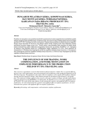 Mohammad, Havid and Mahendro, Sumardjo (2023) Pengaruh pelatihan kerja, kompensasi kerja, dan motivasi kerja terhadap kinerja karyawan pada bidang produksi PT TFG Traveling Asia. JYE: Journal of Young Entrepreneurs, 2 (2): 11. pp. 145-155. ISSN 2964-8521