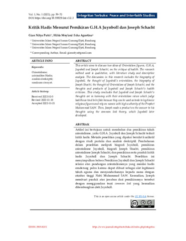 Gian, Nitya Putri and Hilda, Meylani and Icha, Agustina (2022) Kritik hadis menurut pemikiran G.H.A Juynboll dan Joseph Schacht. Integritas Terbuka: Peace and Interfaith Studies, 1 (1): 6. pp. 59-70. ISSN 2985-301X