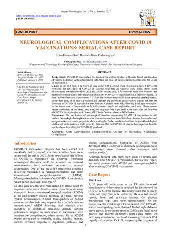 Intan Permata, Sari and Hanindia Riani, Prabaningtyas (2023) Neurological complications after covid 19 vaccinations: serial case report. Magna Neurologica, 1 (1): 3. pp. 9-12. ISSN 2963-6027