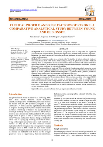 Reza, Stevano and Jacqueline Tasha, Margono and Anyeliria, Sutanto (2023) Clinical profile and risk factors of stroke: a comparative analytical study between young and old onset. Magna Neurologica, 1 (1): 4. pp. 13-16. ISSN 2963-6027