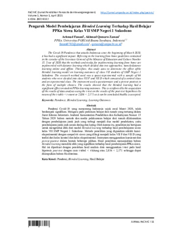 Achmad, Fanani and Akhmad, Qomaru Zaman (2021) Pengaruh model pembelajaran blended learning terhadap hasil belajar PPKn siswa kelas VII SMP Negeri 1 Sukodono. Pacivic: Jurnal Pendidikan Pancasila dan Kewarganegaraan, 1 (1): 2. pp. 11-20. ISSN 2807-9337