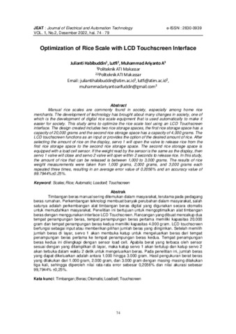 Julianti, Habibuddin and -, Lutfi and Muhammad, Ariyanto A (2022) Optimization of rice scale with LCD touchscreen interface. Journal of Electrical and Automation Technology (JEAT), 1 (2): 5. pp. 74-79. ISSN 2830-0939