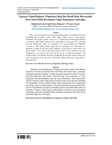 Khoiriyatul, Layly Septi Wahyu Ningrum and I Wayan, Arsana (2022) Upacara Tujuh Bulanan (Tingkeban) bagi ibu hamil pada masyarakat Desa Jubel Kidul Kecamatan Sugio Kabupaten Lamongan. Pacivic: Jurnal Pendidikan Pancasila dan Kewarganegaraan, 2 (1): 5. pp. 58-69. ISSN 2807-9337