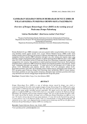 Sabrina, Mardhatillah and Rizal, Imran Ambiar and Putri, Erlyn (2020) Gambaran kejadian demam berdarah dengue (dbd) di wilayah kerja Puskesmas Dempo kota Palembang. MESINA (Medical Scientific Journal), 1 (-): 4. pp. 23-32. ISSN 2746-4148