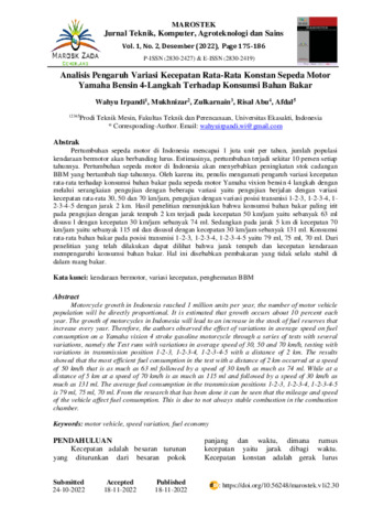 Wahyu, Irpandi and Mukhnizar, Mukhnizar and Zulkarnain, Zulkarnain and Risal, Abu and -, Afdal (2022) Analisis pengaruh variasi kecepatan rata-rata konstan sepeda motor Yamaha bensin 4-langkah terhadap konsumsi bahan bakar. MAROSTEK: Jurnal Teknik, Komputer, Agroteknologi dan Sains, 1 (2): 3. pp. 175-186. ISSN 2830-2427