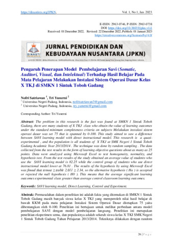 Permasalahan dalam penelitian ini adalah fakta yang ditemukan di SMKN 1 Sintuk Toboh Gadang masih banyak siswa kelas X TKJ yang memperoleh nilai hasil belajar di bawah KKM pada mata pelajaran Instalasi Sistem Operasi Dasar ditetapkan 75 yaitu dibentangkan oleh 0-100. Penelitian ini bertujuan untuk melihat perbedaan antara model pembelajaran SAVI dengan model pembelajaran langsung. Penelitian ini merupakan penelitian eksperimen semu, dan populasinya adalah seluruh siswa kelas X TKJ SMK Negeri 1 Sintuk Toboh Gadang Tahun Pelajaran 2013/2014. Tekniknya dilakukan dengan random sampling. Data yang dikumpulkan dari hasil tes berupa soal-soal tujuan pembelajaran sebanyak 25 butir. Data dianalisis menggunakan Microsoft Excel untuk uji homogenitas, normalitas, dan uji hipotesis. Dari hasil tes belajar, nilai rata-rata siswa yang menggunakan model pembelajaran SAVI adalah 82,25, sedangkan kelompok kontrol siswa yang menggunakan model pembelajaran langsung lebih rendah yaitu 76,81. Hasil pengujian hipotesis dengan menggunakan Microsoft Excel didapatkan bahwa thitung ≥ ttabel 2,011 ≥ 2,34, sehingga hipotesis alternatif (Ha) diterima atau ditolak hipotesis nol (H0). Artinya rata-rata hasil belajar kelas eksperimen yang signifikan lebih besar dari rata-rata hasil belajar kelas kontrol.