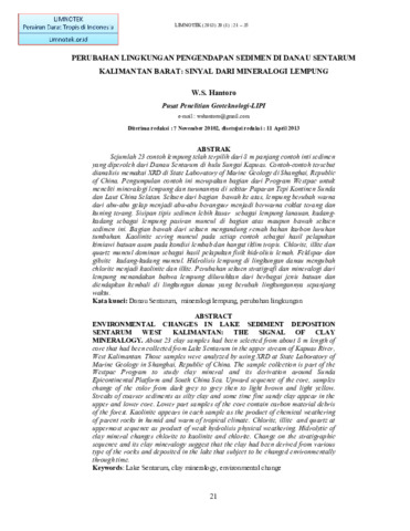 Sejumlah 23 contoh lempung telah terpilih dari 8 m panjang contoh inti sedimen yang diperoleh dari Danau Sentarum di hulu Sungai Kapuas. Contoh-contoh tersebut dianalisis memakai XRD di State Laboratory of Marine Geology di Shanghai, Republic of China. Pengumpulan contoh ini merupakan bagian dari Program Westpac untuk meneliti mineralogi lempung dan turunannya di sekitar Paparan Tepi Kontinen Sunda dan Laut China Selatan. Sekuen dari bagian bawah ke atas, lempung berubah warna dari abu-abu gelap menjadi abu-abu berangsur menjadi berwarna coklat terang dan kuning terang. Sisipan tipis sedimen lebih kasar sebagai lempung lanauan, kadang- kadang sebagai lempung pasiran muncul di bagian atas maupun bawah sekuen sedimen ini. Bagian bawah dari sekuen mengandung remah bahan karbon luruhan tumbuhan. Kaolinite sering muncul pada setiap contoh sebagai hasil pelapukan kimiawi batuan asam pada kondisi lembab dan hangat iklim tropis. Chlorite, illite dan quartz muncul dominan sebagai hasil pelapukan fisik hidrolisis lemah. Feldspar dan gibsite kadang-kadang muncul. Hidrolisis lempung di lingkungan danau mengubah chlorite menjadi kaolinite dan illite. Perubahan sekuen stratigrafi dan mineralogi dari lempung menandakan bahwa lempung diluruhkan dari berbagai jenis batuan dan diendapkan kembali di lingkungan danau yang berubah lingkungannya sepanjang waktu.