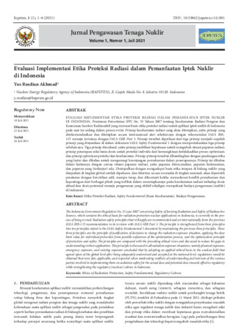 EVALUASI IMPLEMENTASI ETIKA PROTEKSI RADIASI DALAM PEMANFAATAN IPTEK NUKLIR DI INDONESIA. Peraturan Pemerintah (PP) No. 33 Tahun 2007 tentang Keselamatan Radiasi Pengion dan Keamanan Sumber Radioaktif yang memuat basis etika proteksi radiasi untuk aplikasi iptek nuklir di Indonesia pada saat ini sedang dalam proses revisi. Prinsip keselamatan radiasi yang akan diterapkan, yaitu prinsip yang direkomendasikan dan ditetapkan secara internasional dari sebelumnya dengan rekomendasi IAEA BSS115 menuju revisinya dengan IAEAGSRPart3.Prinsip tersebut diperkuat dari tiga prinsip menjadi sepuluh prinsip yang dinyatakan di dalam dokumen IAEASafety Fundamental 1 dengan mempertahankan tiga prinsip sebelumnya.Tiga prinsip dimaksud, yaitu prinsip justifikasi keputusan untuk mengubah situasi paparan radiasi; prinsip penerapan nilai batas dosis untuk proteksi individu dari kemungkinan ketidakadilan proses optimisasi; dan prinsip optimisasi proteksi dan keselamatan.Prinsip-prinsip tersebut dibandingkan dengan pandangan etika yang lazim dan dibahas untuk mengurangi kesenjangan pemahaman dalam penerapannya. Prinsip ini dibahas dalam kaitannya dengan semua situasi paparan radiasi, yaitu paparan direncanakan, paparan kedaruratan, dan paparan yang(terlanjur) ada.Disimpulkan dengan mengadopsi basis etika terapan dibidang nuklir yang disepakati di tingkat global setelah dipahami, dan diterima secara memadai di tingkat nasional, akan diperoleh peraturan dengan bercirikan adil,mampu terap, dan dihormati ketika memoderasi konflik pemahaman dan kepentingan dari berbagai pihak yang terlibat dalam menerapkannya pada keselamatan radiasi terhadap dosis aktual dan dosis potensial menuju pengawasan yang efektif sekaligus memperkuat budaya pengawasan (nuklir) di Indonesia