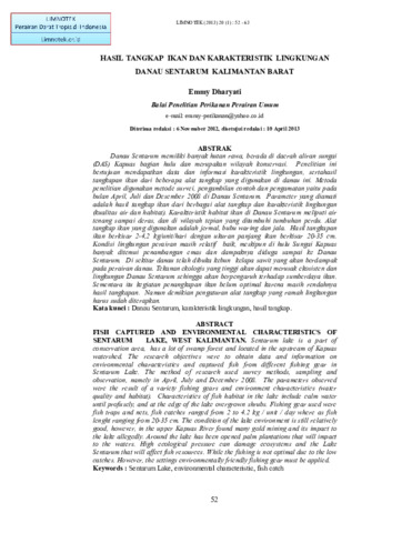 Danau Sentarum memiliki banyak hutan rawa, berada di daerah aliran sungai (DAS) Kapuas bagian hulu dan merupakan wilayah konservasi. Penelitian ini bertujuan mendapatkan data dan informasi karakteristik lingkungan, sertahasil tangkapan ikan dari beberapa alat tangkap yang digunakan di danau ini. Metoda penelitian digunakan metode survei, pengambilan contoh dan pengamatan yaitu pada bulan April, Juli dan Desember 2008 di Danau Sentarum. Parameter yang diamati adalah hasil tangkap ikan dari berbagai alat tangkap dan karakteristik lingkungan (kualitas air dan habitat). Karakteristik habitat ikan di Danau Sentarum meliputi air tenang sampai deras, dan di wilayah tepian yang ditumbuhi tumbuhan perdu. Alat tangkap ikan yang digunakan adalah jermal, bubu waring dan jala. Hasil tangkapan ikan berkisar 2-4,2 kg/unit/hari dengan ukuran panjang ikan berkisar 20-35 cm. Kondisi lingkungan perairan masih relatif baik, meskipun di hulu Sungai Kapuas banyak ditemui penambangan emas dan dampaknya diduga sampai ke Danau Sentarum. Di sekitar danau telah dibuka kebun kelapa sawit yang akan berdampak pada perairan danau. Tekanan ekologis yang tinggi akan dapat merusak ekosisten dan lingkungan Danau Sentarum sehingga akan berpengaruh terhadap sumberdaya ikan. Sementara itu kegiatan penangkapan ikan belum optimal karena masih rendahnya hasil tangkapan. Namun demikian pengaturan alat tangkap yang ramah lingkungan harus sudah diterapkan.
