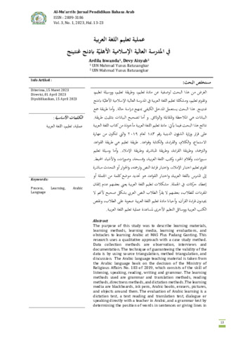 Ardila, Iswanda and Devy, Aisyah (2023) عملية تعليم اللغة العربية ة ابدنج غنتينج يف املدرسة العالية اإلسالمية األه. Al-Mu'arrib: Jurnal Pendidikan Bahasa Arab, 3 (1): 2. pp. 13-23. ISSN 2809-3186