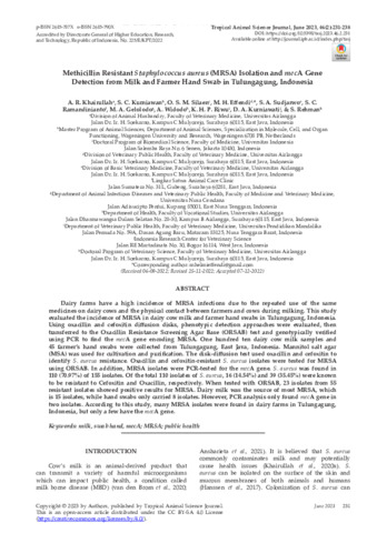 Khairullah, A. R. and Kurniawan, S. C. and Silaen, O. S. M. and Effendi, M. H. and Sudjarwo, S. A. and Ramandinianto, S. C. and Gelolodo, M. A. and Widodo, A. and Riwu, K. H. P. and Kurniawati, D. A. and Rehman, S. (2023) Methicillin Resistant Staphylococcus aureus (MRSA) isolation and meca gene detection from milk and farmer hand swab in Tulungagung, Indonesia. Tropical Animal Science Journal, 46 (2): 12. pp. 231-238. ISSN 2615-787X