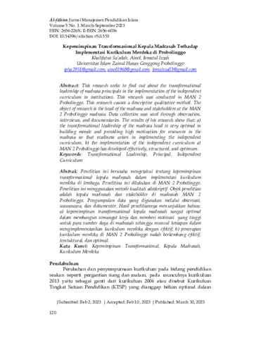 Sa’adah, Khalifatus and Ainol, Ainol and Izzah, Ismatul (2023) Kepemimpinan transformasional kepala madrasah terhadap implementasi kurikulum merdeka di Probolinggo. Ál-fâhim: Jurnal Manajemen Pendidikan Islam, 5 (1): 8. pp. 120-135. ISSN 2656-226X