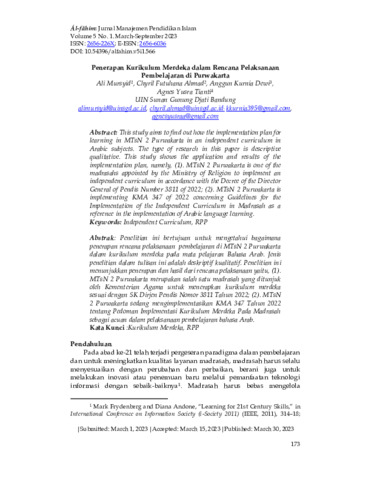 Mursyid, Ali and Ahmad, Chyril Futuhana and Dewi, Anggun Kurnia and Tianti, Agnes Yusra (2023) Penerapan kurikulum merdeka dalam rencana pelaksanaan pembelajaran di Purwakarta. Ál-fâhim: Jurnal Manajemen Pendidikan Islam, 5 (1): 11. pp. 173-187. ISSN 2656-226X