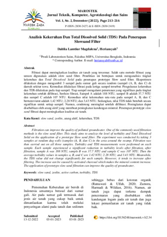 Dahlia Lamtiur, Magdalena and Heriansyah, Heriansyah (2022) Analisis kekeruhan dan total dissolved solid (TDS) pada penerapan slowsand filter. MAROSTEK: Jurnal Teknik, Komputer, Agroteknologi dan Sains, 1 (2): 7. pp. 213-216. ISSN 2830-2427