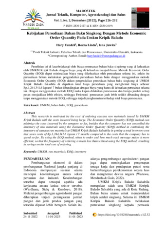 Hary, Fandeli and Rozza, Linda and Isna, Juwita (2022) Kebijakan persediaan bahan baku singkong dengan metode Economic Order Quantity pada UMKM kripik balado. Jurnal Teknik, Komputer, Agroteknologi dan Sains, 1 (2): 9. pp. 226-232. ISSN 2830-2427