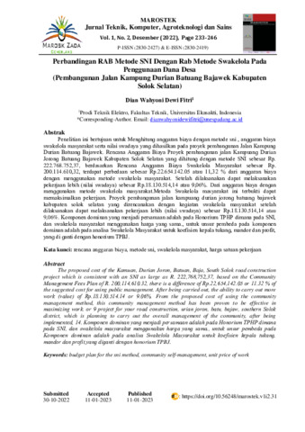 Dian Wahyoni, Dеԝi Fitri (2022) Perbandingan RAB metode SNI dengan RAB metode swakelola pada penggunaan dana desa (pembangunan jalan kampung Durian Batuang Bajawek Kabupaten Solok Selatan). MAROSTEK: Jurnal Teknik, Komputer, Agroteknologi dan Sains, 1 (2): 10. pp. 233-246. ISSN 2830-2427