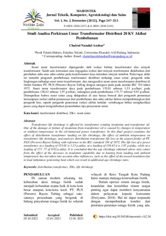 Chairul, Nazalul Anshar (2022) Studi analisa perkiraan umur transformator distribusi 20 KV akibat pembebanan. MAROSTEK: Jurnal Teknik, Komputer, Agroteknologi dan Sains, 1 (2): 11. pp. 247-253. ISSN 2830-2427