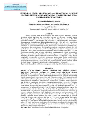 Analisis terhadap indeks keanekaragaman dan indeks saprobik komunitas plankton berkaitan dengan komposisi dan kelimpahan jenisnya di perairan Pelabuhan Kapal Penumpang Desa Ajibata dan Desa Pangaloan, Danau Toba dilakukan pada Mei 2012. Ditemukan sebanyak 71 jenis plankton yang terdiri dari 22 jenis fitoplankton (Cyanophyceae, Chlorophyceae, Desmidiaceae, Diatomae/Bacillariophyceae), dan 49 jenis zooplankton (Flagellata, Rhizopoda dan Rotifera). Pada perairan Ajibata dapat ditemukan 7 takson, sementara itu ada sebanyak 6 takson (kecuali Desmidiaceae) di Pangaloan. Kelimpahan rata- rata plankton di perairan Ajibata dan Pangaloan tergolong rendah yaitu 125 ind/L dan 101 ind/L. Indeks kesamaan komunitas plankton di Pangaloan dan Ajibata menunjukkan cukup perbedaan (36%), namun Indeks keanekaragamannya masing-masing kedua lokasi 3,02 dan 3,23 dapat dikatakan tidak berbeda. Nilai indeks keanekaragaman tersebut menunjukkan bahwa komunitas plankton di dua lokasi termasuk sangat mantap (>3,00). Indeks saprobik komunitas plankton di Ajibata dan Pangaloan berkisar antara + 1,49 hingga + 1,62. Hal ini menunjukan bahwa tingkat pencemaran yang terjadi sangat ringan hingga rendah dengan sedikit beban pencemaran bahan organik maupun anorganik yang berlangsung pada fase mesosaprobik/oligosaprobik. Kualitas air di dua perairan rata-rata normal dan tidak banyak berbeda. Oksigen terlarut (DO) di Ajibata dan Pangaloan adalah 6,28 dan 6,31.