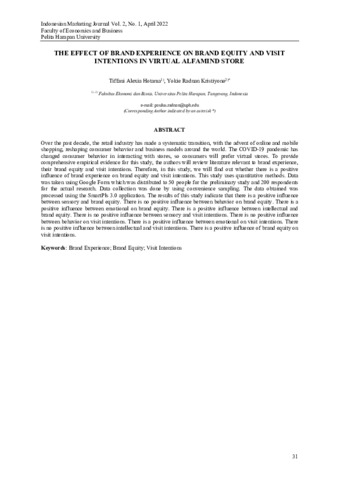 Tiffani, Alexia Hotama and Yokie, Radnan Kristiyono (2022) The effect of brand experience on brand equity and visit intentions in virtual Alfamind Store. Indonesian Marketing Journal, 2 (1): 3. pp. 31-48. ISSN 2776-6004