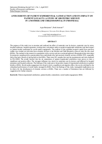 Agus, Heriyanto and Ferdi, Antonio (2022) Antecedents of patient experiential satisfaction and its impact on patient loyalty (a study of obstetric service in a mother and child hospital in Indonesia). Indonesian Marketing Journal, 2 (1): 4. pp. 49-68. ISSN 2776-6004