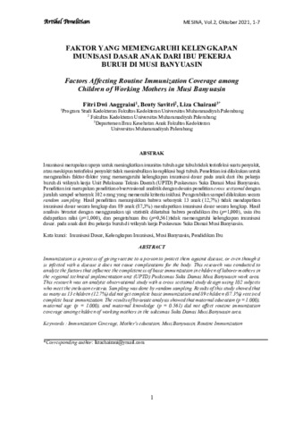 Fitri, Dwi Anggraini and Beuty, Savitri and Liza, Chairani (2021) Faktor yang memengaruhi kelengkapan imunisasi dasar anak dari ibu pekerja buruh di Musi Banyuasin. MESINA (Medical Scientific Journal), 2 (-): 1. pp. 1-7. ISSN 2746-4148