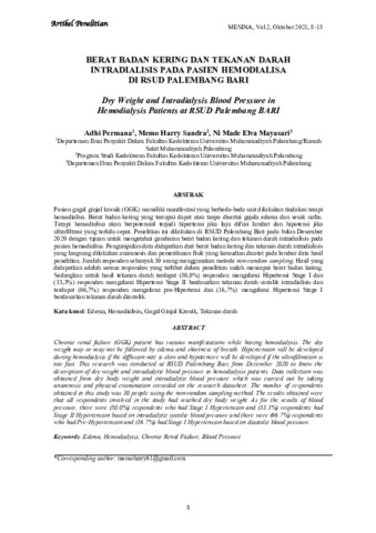 Adhi, Permana and Memo Harry, Sandra and Ni Made Elva, Mayasari (2021) Berat badan kering dan tekanan darah intradialisis pada pasien hemodialisa di RSUD Ppalembang Bari. MESINA (Medical Scientific Journal), 2 (-): 2. pp. 8-15. ISSN 2746-4148