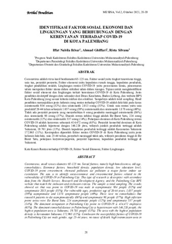Iffat Nabila, Ikbar and Ahmad, Ghiffari and Rista, Silvana (2021) Identifikasi faktor sosial ekonomi dan lingkungan yang berhubungan dengan kerentanan terhadap Covid-19 di kota Palembang. MESINA (Medical Scientific Journal), 2 (-): 5. pp. 28-39. ISSN 2746-4148