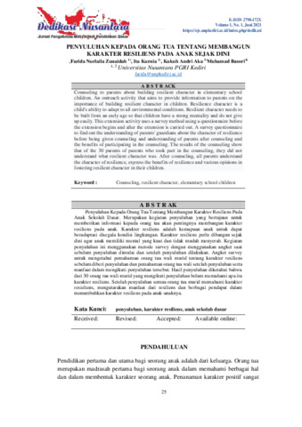 Farida, Nurlaila Zunaidah and Ita, Kurnia and Kukuh, Andri Aka and Muhamad, Basori (2021) Penyuluhan kepada orang tua tentang membangun karakter resiliens pada anak sejak dini. Dedikasi Nusantara: Jurnal Pengabdian Masyarakat Pendidikan Dasar, 1 (1): 4. pp. 25-32. ISSN 2798-172X