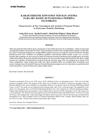 Inda, Dzil Arsy and Ratih, Pratiwi and Otchi, Putri Wijaya and Rista, Silvana (2022) Karakteristik konsumsi teh dan anemia pada ibu hamil di Puskesmas pembina Palembang. MESINA (Medical Scientific Journal), 3 (1): 5. pp. 28-34. ISSN 2746-4148