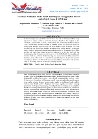Nugrananda, Janattaka and Rahmat, Setyo Jadmiko and Eka, Yuliana Sari and Nourma, Oktaviarini (2021) Sosialisasi pembuatan media komik pembelajaran menggunakan website Make Beliefs Comix di SDN Bukur. Dedikasi Nusantara: Jurnal Pengabdian Masyarakat Pendidikan Dasar, 1 (2): 2. pp. 47-53. ISSN 2798-172X