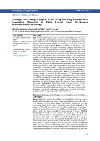 Filia Icha, Sukamto and Imaniar Dwi, Alda and Metti, Verawati (2022) Dukungan sosial dengan tingkat stress orang tua yang memiliki anak penyandang disabilitas di Klinik Pelangi Centre Development Neurorehabilitation Ponorogo. Journal of Nursing Invention, 3 (2): 4. pp. 95-102. ISSN 2828-281X