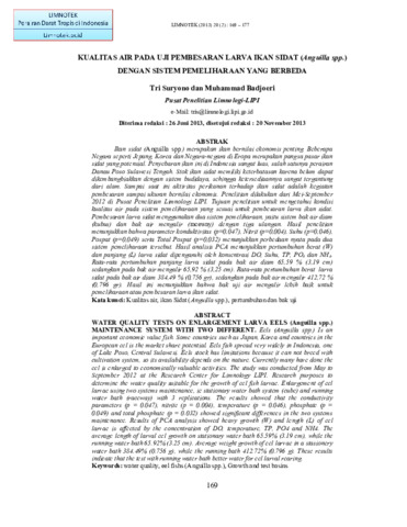 Tri, Suryono and Muhammad, Badjoeri (2013) Kualitas air pada uji pembesaran larva ikan sidat (Anguilla spp.) dengan sistem pemeliharaan yang berbeda. Limnotek : Perairan Darat Tropis di Indonesia, 20 (2): 6. pp. 169-177. ISSN 2549-8029