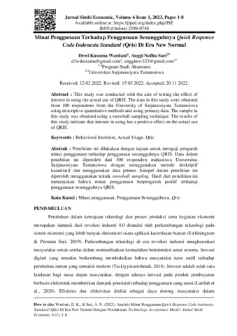 Penelitian ini dilakukan dengan tujuan untuk menguji pengaruh minat penggunaan terhadap penggunaan sesungguhnya QRIS. Data dalam penelitian ini diperoleh dari 100 responden mahasiswa Universitas Sarjanawiyata Tamansiswa dengan menggunakan metode deskriptif kuantitatif dan menggunakan data primer. Sampel dalam penelitian ini diperoleh menggunakan teknik snowball sampling. Hasil dari penelitian ini menunjukan bahwa minat penggunaan berpengaruh positif terhadap penggunaan sesungguhnya QRIS.