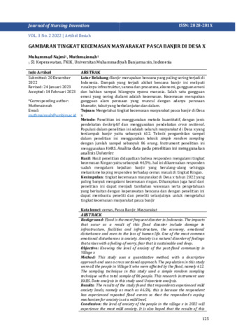 Muhammad, Najmi and Muthmainnah, Muthmainnah (2022) Gambaran tingkat kecemasan masyarakat pasca banjir di desa x. Journal of Nursing Invention, 3 (2): 8. pp. 125-130. ISSN 2828-281X