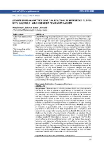 Mery, Lestari and Lukman, Harun and Hiryadi, Hiryadi (2022) Gambaran upaya deteksi dini dan pencegahan hipertensi di Desa Kayu Bawang di wilayah kerja Puskesmas Gambut. Journal of Nursing Invention, 3 (2): 9. pp. 131-138. ISSN 2828-281X