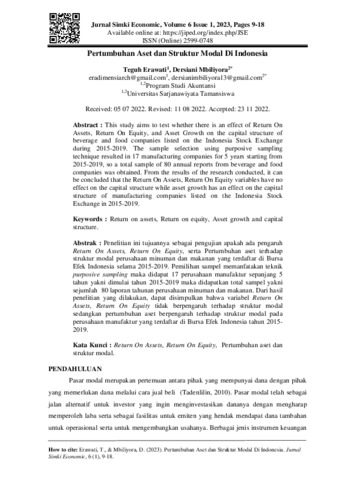 Teguh, Erawati and Dersiani, Mbiliyora (2023) Pertumbuhan aset dan struktur modal di Indonesia. Jurnal Simki Economic, 6 (1): 2. pp. 9-18. ISSN 2599-0748