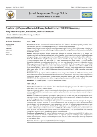 Neng, Dheni Widayanti and Rini, Marini and Inez, Noviani Indah (2021) Analisis uji paparan radiasi di ruang isolasi covid-19 RSUD Karawang. Jurnal Pengawasan Tenaga Nuklir, 1 (1): 7. pp. 31-35. ISSN 2798-513X