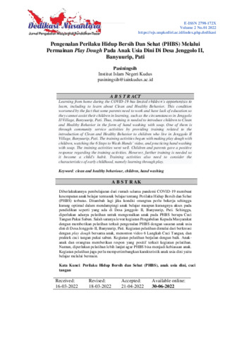 Pasiningsih, Pasiningsih (2022) Pengenalan Perilaku Hidup Bersih dan Sehat (PHBS) melalui permainan play dough pada anak usia dini di Desa Jenggolo II, Banyuurip, Pati. Dedikasi Nusantara: Jurnal Pengabdian Masyarakat Pendidikan Dasar, 2 (1): 2. pp. 8-16. ISSN 2798-172X