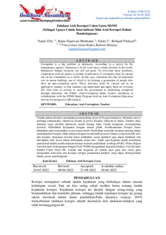 Nanik, Ulfa and Ratna Fajarwati Meditama, Fajarwati Meditama and Salim, Salim and Rofiqoh, Firdausi (2022) Edukasi anti korupsi calon guru SD/MI (sebagai upaya untuk internalisasi nilai anti korupsi dalam pembelajaran). Dedikasi Nusantara: Jurnal Pengabdian Masyarakat Pendidikan Dasar, 2 (1): 3. pp. 17-24. ISSN 2798-172X