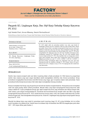 Agil, Aninda Putri and Aswan, Munang and Isnaini, Nurisusilawati (2023) Pengaruh K3, lingkungan kerja, dan shift kerja terhadap kinerja karyawan PT. XYZ. Factory Jurnal Industri, Manajemen dan Rekayasa Sistem Industri, 1 (3): 1. pp. 74-85. ISSN 2961-953X