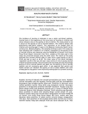 Hendrawati, Sri and Mediani, Henny Suzana and Salsabila, Nada Shofi (2023) Kualitas hidup balita stunted. Manuju : Malahayati Nursing Journal, 5 (5): 3. pp. 1324-1342. ISSN 2655-2728