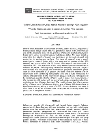 Sumarni, Sumarni and Hanum, Parida and Ginting, Lidia Rasmah Kitanta Br and Anggraini, Putri (2023) Pengaruh teknik breast care terhadap peningkatan pengeluaran asi pada ibu post partum. Manuju : Malahayati Nursing Journal, 5 (5): 4. pp. 1343-1350. ISSN 2655-2728