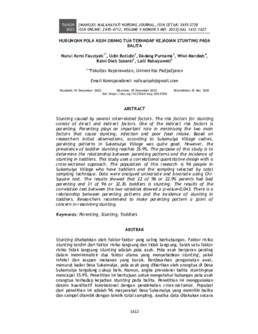 Fauziyah, Nurul Azmi and Rosidin, Udin and Purnama, Dadang and Mardiah, Wiwi and Susanti, Raini Diah and Rahayuwati, Laili (2023) Hubungan pola asuh orang tua terhadap kejadian stunting pada balita. Manuju : Malahayati Nursing Journal, 5 (5): 11. pp. 1412-1427. ISSN 2655-2728