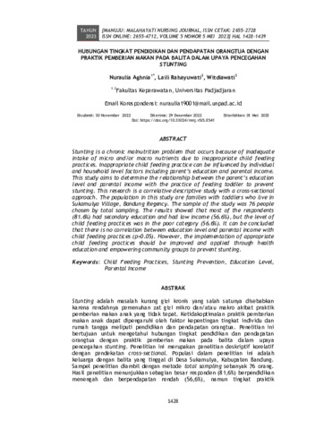 Aghnia, Nuraulia and Rahayuwati, Laili and Witdiawati, Witdiawati (2023) Hubungan tingkat pendidikan dan pendapatan orangtua dengan praktik pemberian makan pada balita dalam upaya pencegahan stunting. Manuju : Malahayati Nursing Journal, 5 (5): 12. pp. 1428-1439. ISSN 2655-2728