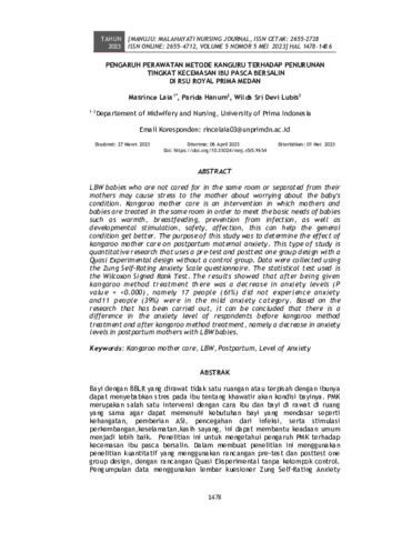 Laia, Masrince and Hanum, Parida and Lubis, Wilda Sri Devi (2023) Pengaruh perawatan metode kanguru terhadap penurunan tingkat kecemasan ibu pasca bersalin di RSU Royal Prima Medan. Manuju : Malahayati Nursing Journal, 5 (5): 17. pp. 1478-1486. ISSN 2655-2728