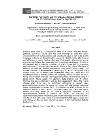 Husaini, Muhammad and Asrizal, Asrizal and Putra, Imam Budi (2023) The effect of honey and zinc cream as topical dressing for epithelization in diabetic foot ulcer. Manuju : Malahayati Nursing Journal, 5 (5): 22. pp. 1534-1546. ISSN 2655-2728