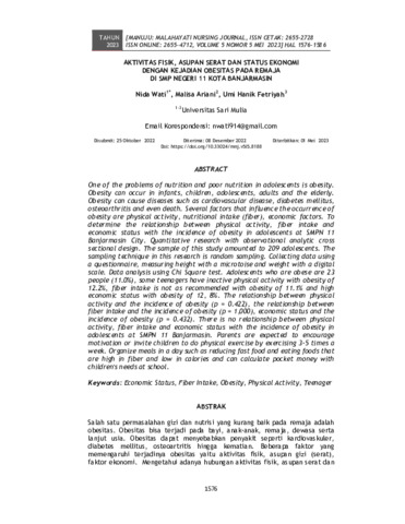 Wati, Nida and Ariani, Malisa and Fetriyah, Umi Hanik (2023) Aktivitas fisik, asupan serat dan status ekonomi dengan kejadian obesitas pada remaja di SMP Negeri 11 Kota Banjarmasin. Manuju : Malahayati Nursing Journal, 5 (5): 26. pp. 1576-1586. ISSN 2655-2728